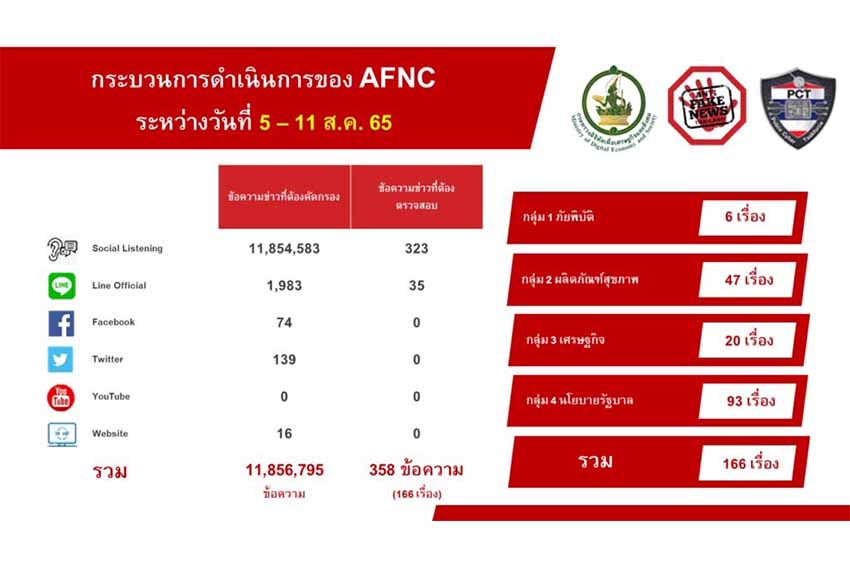 น.ส.นพวรรณ หัวใจมั่น โฆษกกระทรวงดิจิทัลเพื่อเศรษฐกิจและสังคมฝ่ายการเมือง (ดีอีเอส) เปิดเผยว่า ดีอีเอส สรุปสถานการณ์ข่าวปลอมรอบสัปดาห์ ระหว่างวันที่ 5 – 11 ส.ค. 65 โดยศูนย์ต่อต้านข่าวปลอม มีข้อความเข้ามา 11,856,795 ข้อความ ซึ่งจากการคัดกรอง มีข้อความที่ต้องดำเนินการตรวจสอบ (Verify) จำนวน 358 ข้อความ เรื่องที่ต้องดำเนินการตรวจสอบ 166 เรื่อง เป็นข่าวในกลุ่มนโยบายรัฐ/ข่าวสารราชการมากสุด จำนวน 93 เรื่อง