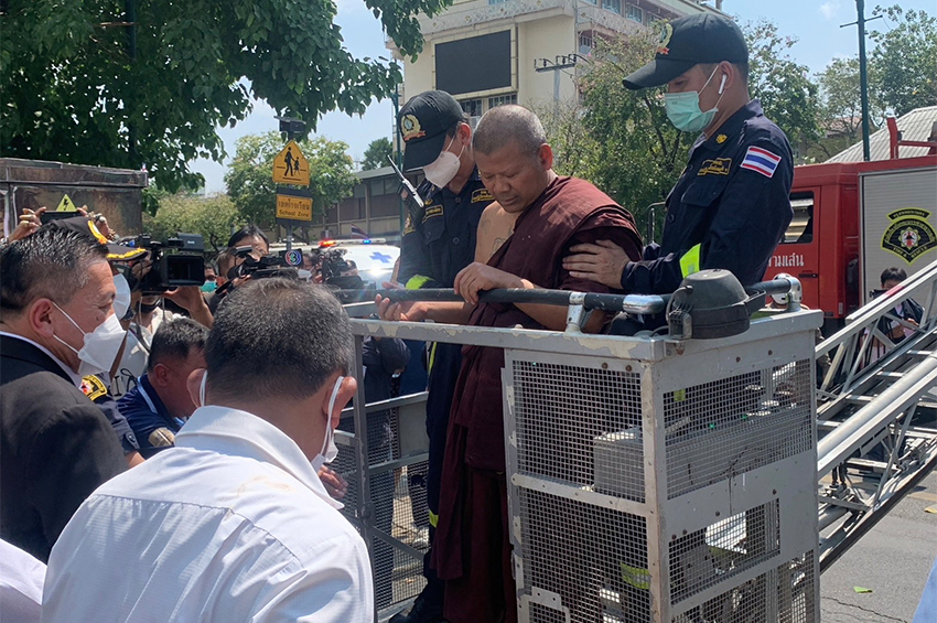 จากนั้น เวลา 13.00 น. เจ้าที่ได้นำรถกระเช้าจากสถานีดับเพลิงสามเสน พร้อมนำเจ้าหน้าที่ และพระสงฆ์ที่มายื่นหนังสือด้วยกันขึ้นกระเช้า ไปพูดคุยเกลี้ยกล่อมประมาณ 10 นาที พระครูปลัดธีรธนัชณฤทธา จึงได้ยอมขึ้นกระเช้าลงมา