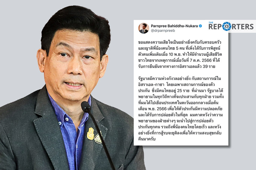 “ขอแสดงความเสียใจเป็นอย่างยิ่งครับกับครอบครัวและญาติพี่น้องคนไทย 5 คน ที่เพิ่งได้รับการพิสูจน์ตัวตนเพิ่มเติมเมื่อ 10 พ.ย. ทำให้มีจำนวนผู้เสียชีวิตชาวไทยจากเหตุการณ์เมื่อวันที่ 7 ต.ค. 2566 ที่ได้รับการยืนยันจากทางการอิสราเอลแล้ว 39 ราย