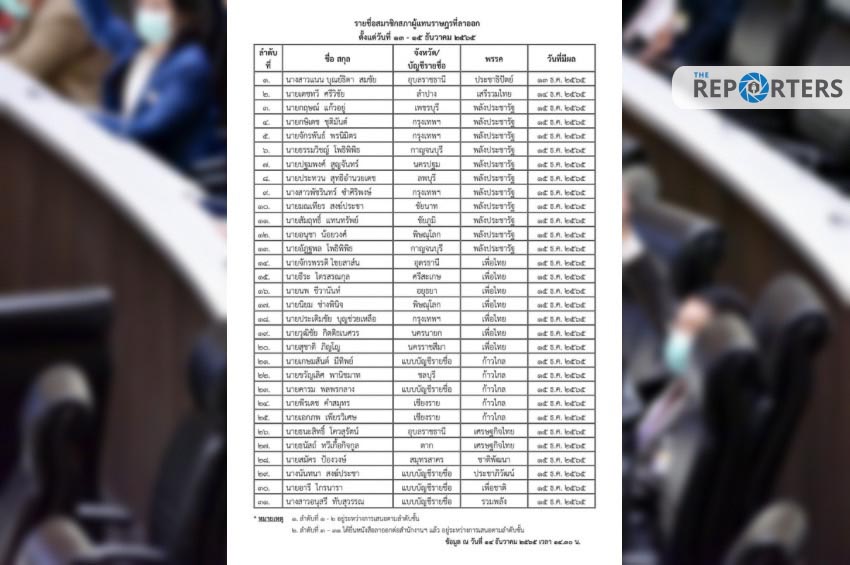 วันนี้ (14 ธ.ค. 65) ผู้สื่อข่าวรายงานว่า มีสมาชิกสภาผู้แทนราษฎรทยอยลาออกตั้งแต่เมื่อวันที่ 13-15 ธันวาคม 2565 จำนวน 31 คน ประกอบด้วย