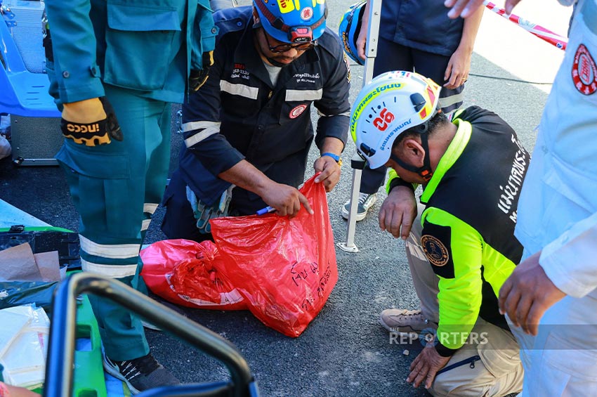 วันนี้ (15 มี.ค. 68) เมื่อเวลาประมาณ 15:20 น. เจ้าหน้าที่ได้ทำการรื้อถอนโครงเหล็ก และซากปูนที่ถล่มลงมายังบริเวณถนนทางการพิเศษ ทางเจ้าหน้าที่ได้พบกระเป๋า 2 ใบ ซึ่งในกระเป๋ามีทรัพย์สิน ทั้งสร้อยคอทองรูปพรรณ เงินสด พร้อมด้วยเอกสารประจำตัวของแรงงานต่างชาติหญิง ชาวกัมพูชา ซึ่งพบว่า เป็นของผู้บาดเจ็บ ปอดฉีก ถูกนำตัวไปรักษาที่โรงพยาบาลสุขสวัสดิ์ก่อนหน้านี้