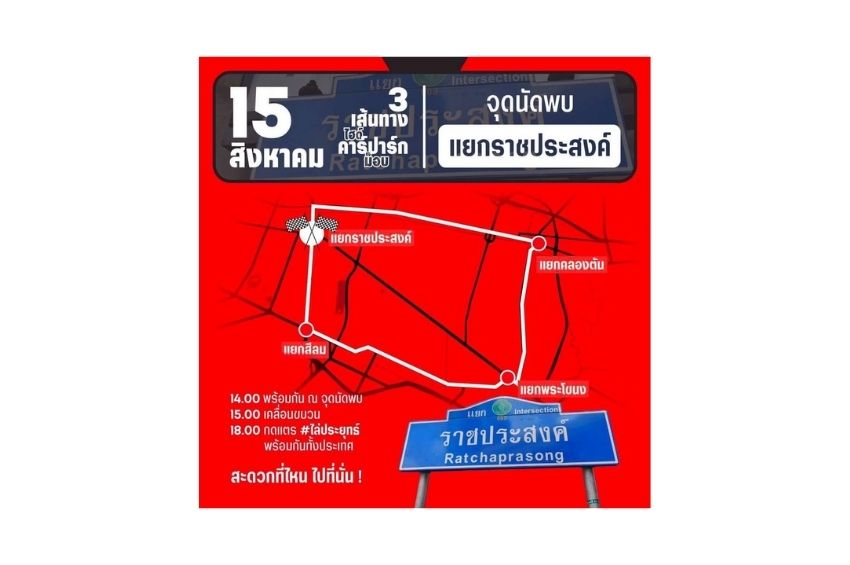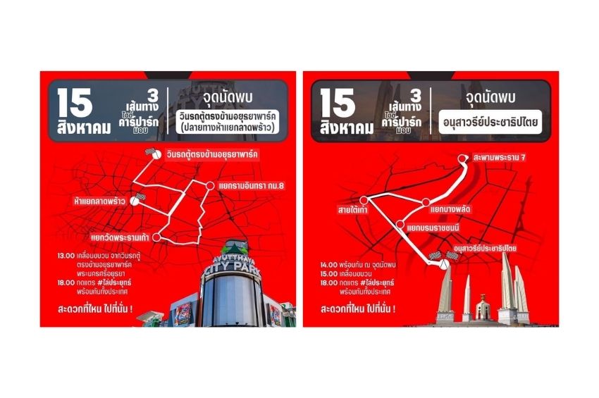 การชุมนุม Car Park ในวันนี้ 15 ส.ค.64 มี 3 จุดหลักที่นัดหมาย เส้นทางแรก เริ่มเวลา 13.00 น.ที่จุดนัดพบ วินรถตู้ตรงข้ามอยุธยาพาร์ค จ.พระนครศรีอยุธยา (ปลายทางห้าแยกลาดพร้าว) นำโดยนายสมบัติ บุญงามอนงค์ หรือ บก.ลายจุด เส้นทางจะเข้ากรุงเทพมหานคร เส้นทางผ่านฟิวเจอร์ปาร์ครังสิต ผ่านแยกรามอินทรา และ แยกวัดพระรามเก้า