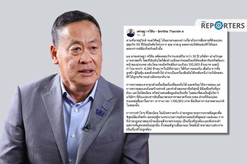วันนี้ (16 ส.ค. 66) นายเศรษฐา ทวีสิน แคนดิเดตนายกรัฐมนตรีจากพรรคเพื่อไทย อดีตผู้บริหารแสนสิริโพสต์ข้อความผ่านเฟซบุ๊กส่วนตัว “เศรษฐา ทวีสิน – Srettha Thavisin” ตอบโต้ นายชูวิทย์ กมลวิศิษฎ์ กรณีการซื้อขายที่ดินของ บมจ.แสนสิริ โดยมีใจความว่า