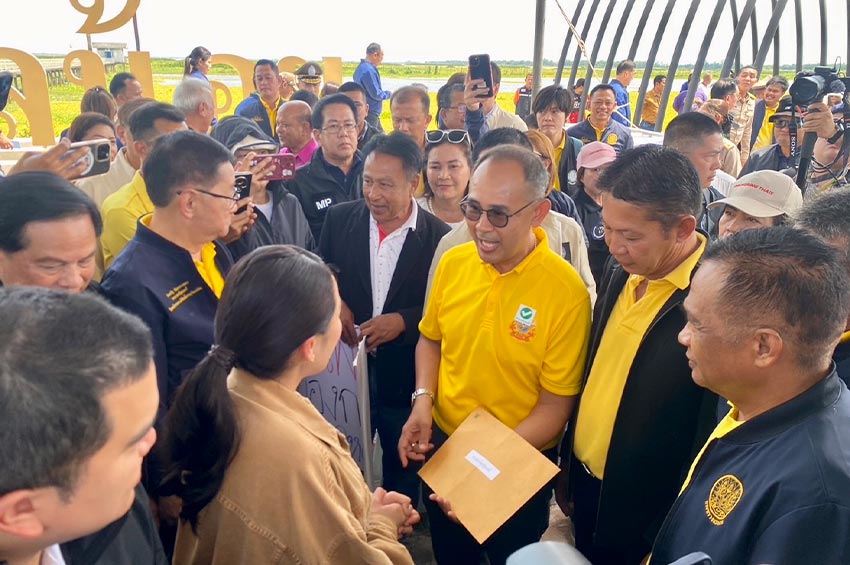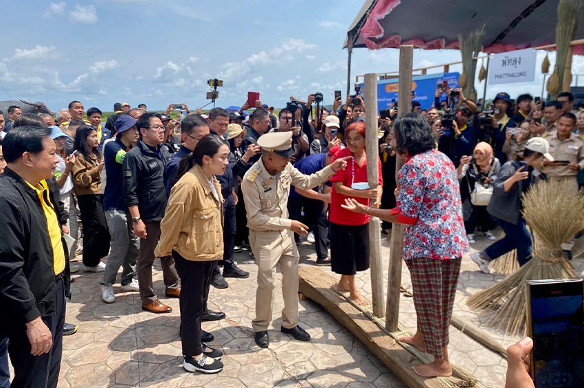ทันทีที่นางสาวแพทองธาร เดินทางมาถึงได้ป้อนหญ้าควายปลักน้ำ ก่อนที่จะรับยื่นหนังสือจากประชาชนชาวพัทลุง ขอให้นางสาวแพทองธาร อนุมัติสะพานข้ามทะเลสาบสงขลา โดยได้เขียนป้ายข้อความเป็นภาษาใต้ ระบุว่า “สะใภ้คนใต้ ฝากช่วยเรื่องสะพานข้ามเลสาบด้วย“