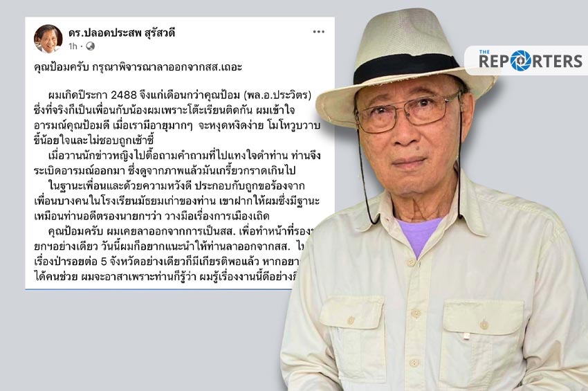 วันนี้ (17 ส.ค. 67) ดร.ปลอดประสพ สุรัสวดี อดีตรองนายกรัฐมนตรี โพสต์ข้อความผ่านเพจเฟซบุ๊ก ‘ดร.ปลอดประสพ สุรัสวดี’ กล่าวถึงกรณีที่ พล.อ.ประวิตร วงษ์สุวรรณ หัวหน้าพรรคพลังประชารัฐ แสดงพฤติกรรมใช้ความรุนแรงกับสื่อมวลชน ว่า