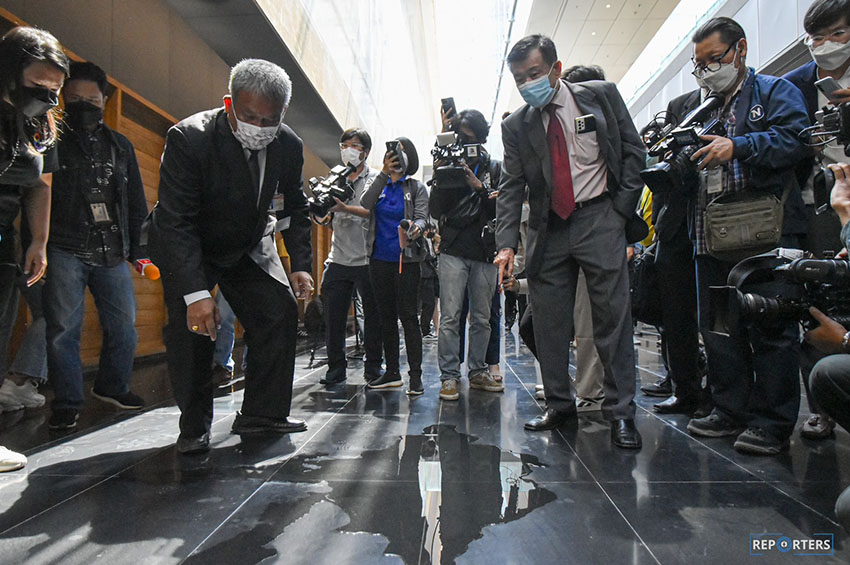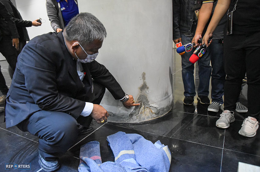 จนสุดท้าย ได้พาสื่อมวลชนลงไปดูพื้นที่ที่เป็นปัญหาเอง โดยไม่ได้ทำเรื่องขออนุญาตเข้าพื้นที่ และมีเจ้าที่สำนักรักษาความปลอดภัยเดินตามจนจบการพาชม โดยจุดแรกที่พาไปคือเสาที่มีตาน้ำไหลออกมา ที่อยู่บริเวณโซนห้องสัมมนา จากนั้นพาไปดูพื้นที่มีน้ำผุดออกมาจากใต้ดิน ก่อนที่จะพาสื่อมวลชนออกไปที่ลานจอดรถที่มีผุดออกมาจากเสา ก่อนที่จะนำผ้า 7 สี ไปผูกบริเวณเสาตอม่อ 014 ที่ลานจอดรถชั้น B2 เพื่อ เป็นการแสดงสัญลักษณ์เชิงประชด ว่าเสาต้นนี้มีความศักดิ์สิทธิ์เพราะมีน้ำผุดออกมา พร้อมเชิญชวนประชาชนที่อยากจะขอเลขเด็ดก็มาขอที่รัฐสภาได้