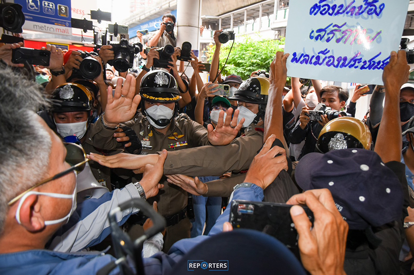 ในช่วงเวลา 11:35 น. มีมวลชนชูป้ายต่อต้านรัฐบาลของ พล.อ.ประยุทธ์ จันทร์โอชา นายกรัฐมนตรี บริเวณแนวของเจ้าหน้าที่ ก่อนที่เจ้าหน้าที่จะพยามยึดป้ายผ้า และผลักดันออกไป