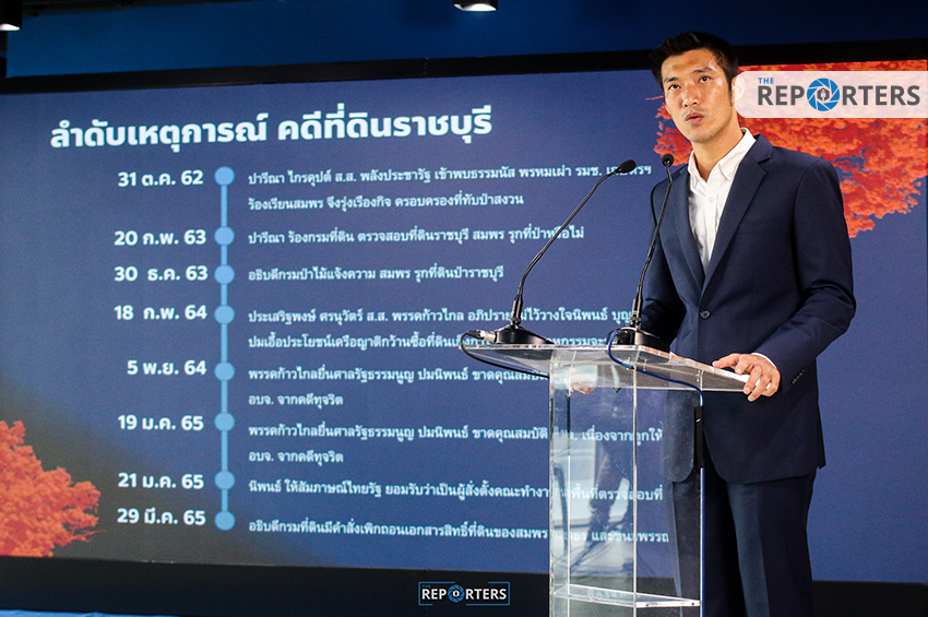 นายธนาธร ชี้แจงคดีที่ดินราชบุรีว่า เป็นเรื่องที่เจ็บปวดต่อทั้งตนเอง และครอบครัวที่ถูกตราหน้าโกงชาติ โกงแผ่นดิน โกงป่า โดยลักษณะการซื้อที่ดินดังกล่าวเป็นการซื้อทั้งผืนต่อจากบริษัทมิตรผล และไม่เคยวิ่งเต้นให้เปลี่ยนรูปแบบกรรมสิทธิ์ถือครอง เป็น นส. 3 ก.มาตั้งแต่ต้น หากเข้าไปดูในพื้นที่จะเห็นว่า ที่ดินดังกล่าวยังดำรงสภาพเป็นป่า