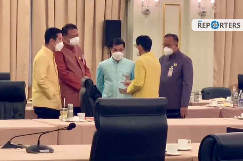 ขณะที่พลเอกประยุทธ์ จันทร์โอชา นายกรัฐมนตรีและรัฐมนตรีว่าการกระทรวงกลาโหม พลเอกประวิตร วงษ์สุวรรณรองนายกรัฐมนตรี และ พลเอกอนุพงษ์ เผ่าจินดา รัฐมนตรีว่าการกระทรวงมหาดไทย เปิดห้องสีเหลือง ที่อยู่ติดกับห้องประชุมคณะรัฐมนตรีพูดคุยกัน โดยในช่วงหนึ่งพลเอกประยุทธ์ ได้เดินผ่านกลุ่มรัฐมนตรี ที่จับวงร่วมพูดคุยกันอยู่ ก่อนจะเดินทางเข้าที่ห้องสีเหลือง ได้แวะทักทายพูดคุยเล็กน้อย โดยมีนายสุชาติ ได้ยกมือไหว้ จากนั้นพลเอกประยุทธ์ ได้เดินฝ่าวงสนทนา ไปยังห้องสีเหลือง ซึ่งก่อนถึงห้องสีเหลือง ได้หันกลับมองกลุ่มรัฐมนตรี ดังกล่าวอีกครั้ง พร้อมได้ยกนิ้วโป้ง ซึ่งคาดว่าจะเป็นการให้กำลังใจกลุ่มรัฐมนตรีดังกล่าว ในขณะที่กลุ่มรัฐมนตรียังคงยืนจับกลุ่มพูดคุยปรึกษากับนายวิษณุยาวนานกว่า 1 ชั่วโมง