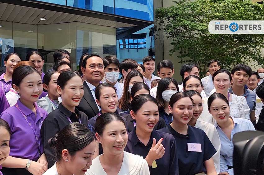 จากนั้นนายกรัฐมนตรีได้ถ่ายรูปเซลฟี่ ร่วมกับ ลูกเรือ (แอร์โฮสเตส) รุ่นใหม่ และส่งมินิฮาร์ทอย่างเป็นกันเอง ทั้งนี้ก่อนที่คุณเอกประยุทธ์จะเดินทางกลับได้หันมาส่งสัญลักษณ์ โบกมือให้กับพนักงานการบินไทยที่มารอส่ง และส่งสัญลักษณ์ I love you พร้อมกับระบุว่าการบินไทยเขาเรียกว่ารักคุณเท่าฟ้าใช่ไหม แต่วันนี้นายกรัฐมนตรีรักพวกเธอเท่าฟ้าด้วย ก่อนที่จะนำมือมาทาบที่อก พร้อมกับกล่าวต่อว่าช่วยกัน ช่วยกันทำให้สำเร็จ ขอบคุณทุกอย่าง และเมื่อเดินขึ้นรถได้หันมาส่งสัญลักษณ์ I love you ให้พนักงานที่ยืนรอส่งอยู่ฝั่งตรง นำมือมาทุบที่หน้าอกด้านซ้ายเบาๆ โดยขณะที่รถกำลังจะเคลื่อนออก พลเอกประยุทธ์ ได้หันมาบอกพนักงานอีกครั้งว่าตนขอให้กำลังใจทุกคน