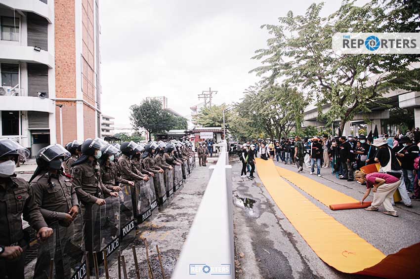 ผู้ชุมนุมปักหลักหน้า สน.ทุ่งสองห้อง กดดัน ตร.ปล่อยมวลชนที่ถูกคุมขัง