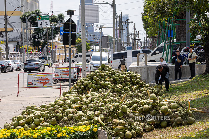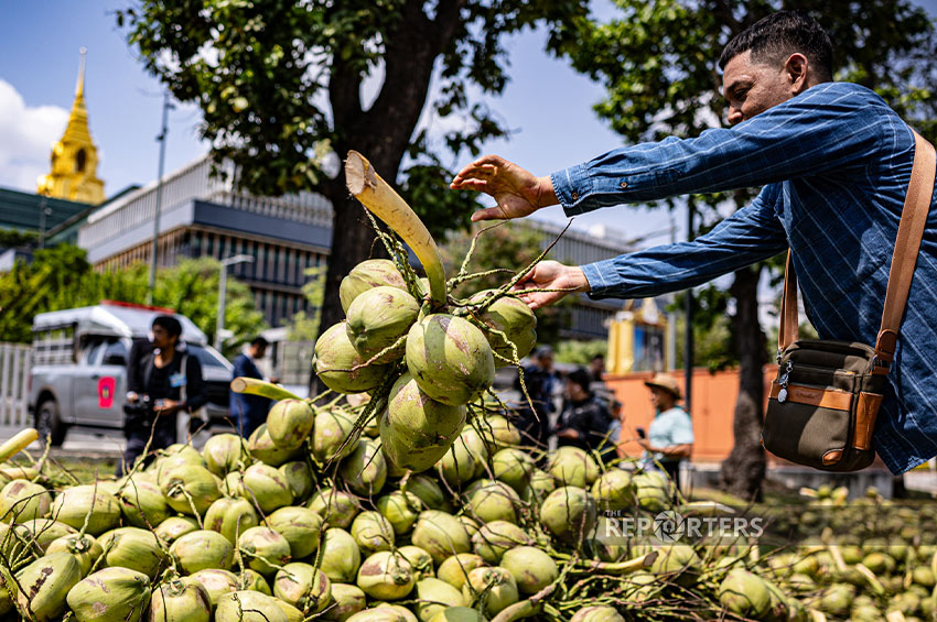 บรรยากาศบริเวณด้านหน้าอาคารรัฐสภา กลุ่มเกษตรกรได้นำมะพร้าวน้ำหอมมากองรวมกัน เพื่อสะท้อนปัญหาราคาผลผลิตที่ตกต่ำอย่างหนักในช่วงหลายเดือนที่ผ่านมา
