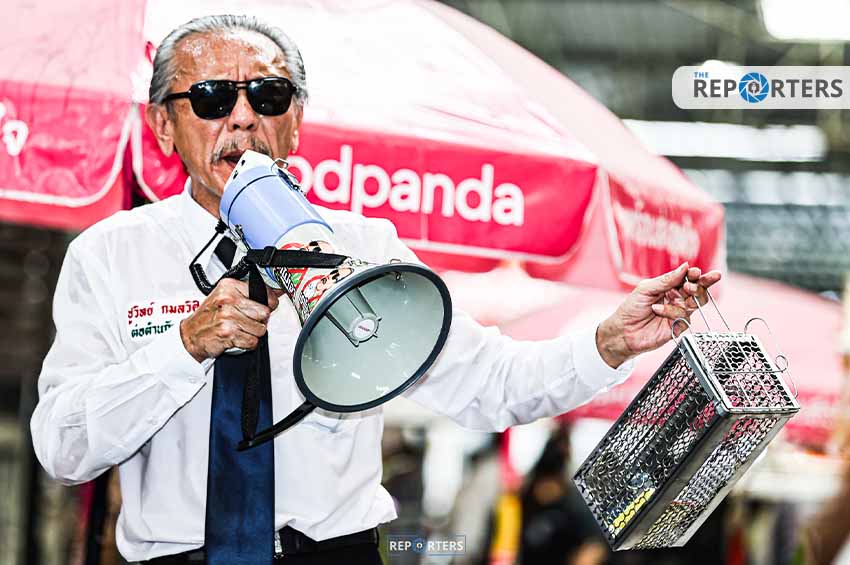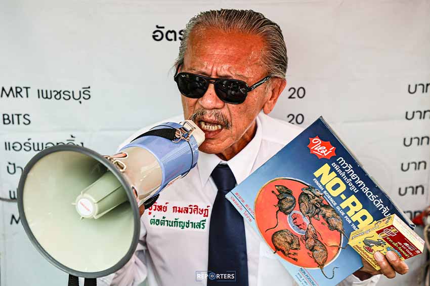 วันนี้ (19 เม.ย. 66) นายชูวิทย์ กมลวิศิษฎ์ จัดกิจกรรมรณรงค์ต่อต้านนโยบายกัญชาเสรี ที่ตลาดรวมทรัพย์ ถนนอโศกมนตรี เขตวัฒนา กทม. วันนี้มาในธีม “จับหนู” โดยนำ กาว-กรงดักหนู พร้อมยาเบื่อหนู โชว์จับหนู จากนั้น นายชูวิทย์ เดินแจกเข็มกลัดและสติ๊กเกอร์ต้านกัญชาเสรี ภายในตลาดรวมทรัพย์ มีพ่อค้าแม่ค้า และพนักงานออฟฟิศในย่านอโศกให้ความสนใจ