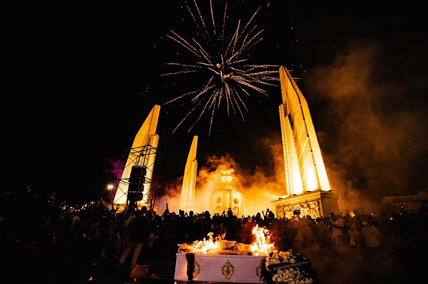 จากนั้นเป็นการแสดงออกเชิงสัญลักษณ์พิธีฌาปนกิจ สว.และศาลรัฐธรรมนูญ ให้ประชาชนร่วมวางดอกไม้จันทน์ พร้อมจุดพลุ โดยนายโสภณ สุรฤทธิ์ธำรง (เก็ท โสภณ) กลุ่มโมกหลวงริมน้ำ ได้กล่าวถึงเหตุผลของการจุดพลุ ย้อนกลับไปเมื่อครั้งที่ถูกคุมขังอยู่ในเรือนจำ ได้ยินเสียงพลุที่มวลชนจุดให้กำลังใจท่ามกลางความเงียบเหงา ซึ่งเป็นเหมือนสิ่งที่สร้างความหวังบ ขอให้ทุกคนไม่ต้องตกใจกับไอความร้อน เพราะเป็นสิ่งที่แผดเผาเผด็จการ และปรสิตประชาธิปไตย