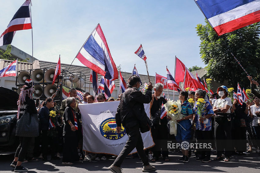 หลังจากนั้น มวลชนได้ตะโกนพร้อมกันว่า “นายกฯ สู้ ๆ” และได้มอบดอกไม้ให้กำลังใจกับนายกรัฐมนตรี