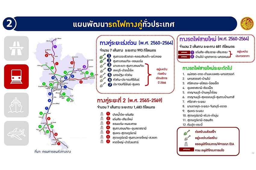2) แผนพัฒนารถไฟทางคู่ระยะที่ 2 (พ.ศ. 2565 – 2569) จำนวน 7 เส้นทาง ระยะทาง 1,483 กิโลเมตร ปัจจุบันอยู่ระหว่างขออนุมัติโครงการและจัดทำรายงาน EIA