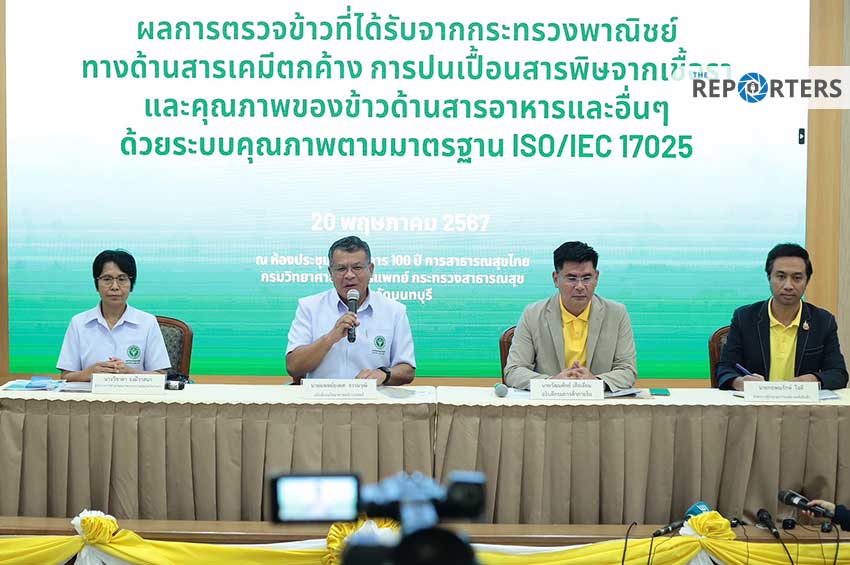 วันนี้ (20 พ.ค. 67) นายแพทย์ยงยศ ธรรมาวุฒิ อธิบดีกรมวิทยาศาสตร์การแพทย์ นางวิชาดา จงมีวาสนา ผู้อำนวยการสำนัก คุณภาพและความปลอดภัยของอาหาร นายวัฒนศักดิ์ เสือเอี่ยม อธิบดีกรมการค้าภายใน และนายกฤษณรักษ์ ใจดี รักษาการผู้อำนวยการองค์การคลังสินค้า แถลงข่าว ผลการตรวจข้าวที่ได้รับจากกระทรวงพาณิชย์ทางด้านสารเคมีตกค้าง การปนเปื้อนสารพิษจากเชื้อรา และคุณภาพของข้าวด้านสารอาหาร และอื่น ๆ ด้วยระบบคุณภาพตามมาตรฐาน ISO/IEC 17025
