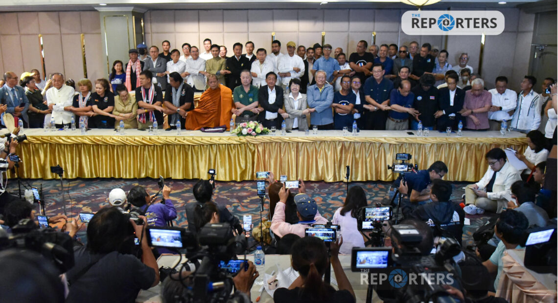 วันนี้ (20 มิ.ย. 68) ที่โรงแรมรัตนโกสินทร์ กลุ่มแกนนำรวมพลังแผ่นดิน นัดรวมตัวแถลงขับไล่ นางสาวแพทองธาร ชินวัตร นายกรัฐมนตรี ออกจากตำแหน่ง เพื่อรับผิดชอบต่อกรณีคลิปเสียงการสนทนาระหว่าง น.ส.แพทองธาร ชินวัตร นายกรัฐมนตรี กับ สมเด็จฮุน เซน ประธานวุฒิสภากัมพูชา โดยมี เจิมศักดิ์ ปิ่นทอง, แก้วสรร อติโพธิ, ขวัญสรวง อติโพธิ, ปรีดา เตียสุวรรณ์, สมชาย แสวงการ, ชาญชัย อิสระเสนารักษ์, ประสาร มฤคพิทักษ์, จเด็จ อินสว่าง, ประพันธ์ คูณมี, พล.ต.อ. เสรีพิศุทธ์ เตมียเวส, พล.อ. สมเจตน์ บุญถนอม, พล.ท. กนก เนตระคเวสนะ, พล.ท.นันทเดช เมฆสวัสดิ์, พล.ต.นพ. เหรียญทอง แน่นหนา, กษิต ภิรมย์, นพ.วรงค์ เดชกิจวิกรม, ถาวร เสนเนียม, ถวิล เปลี่ยนศรี, ปานเทพ พัวพงษ์พันธ์, รสนา โตสิตระกูล, ม.ล.วัลย์วิภา จรูญโรจน์, คมสัน โพธิ์คง, นพ.ตุลย์ สิทธิสมวงศ์, เจษฎ์ โทณะวณิก, ไชยันต์ ไชยพร, นันทิวัฒน์ สามารถ, วีระ สมความคิด, แซมดิน เลิศบุศย์, สนธิญาณ ชื่นฤทัยในธรรม, อัญชะลี ไพรีรัก, หฤทัย ม่วงบุญศรี (อุ๊หฤทัย), ชัชชัย สุขขาวดี (หรั่ง ร็อคเคสตร้า), สาวิทย์ แก้วหวาน, มานพ เกื้อรัตน์, คมสันต์ ทองศิริ, ณีรนุช จิตต์สม, เสน่ห์ หงษ์ทอง, เครือข่ายองค์กรแรงงานรัฐวิสาหกิจ, จตุพร พรหมพันธ์, นิติธร ล้ำเหลือ, พิชิต ไชยมงคล, นัสเซอร์ ยีหมะ, ใจเพชร กล้าจน (พร้อมผู้ชุมนุมกลุ่มคปท. และกองทัพธรรม)