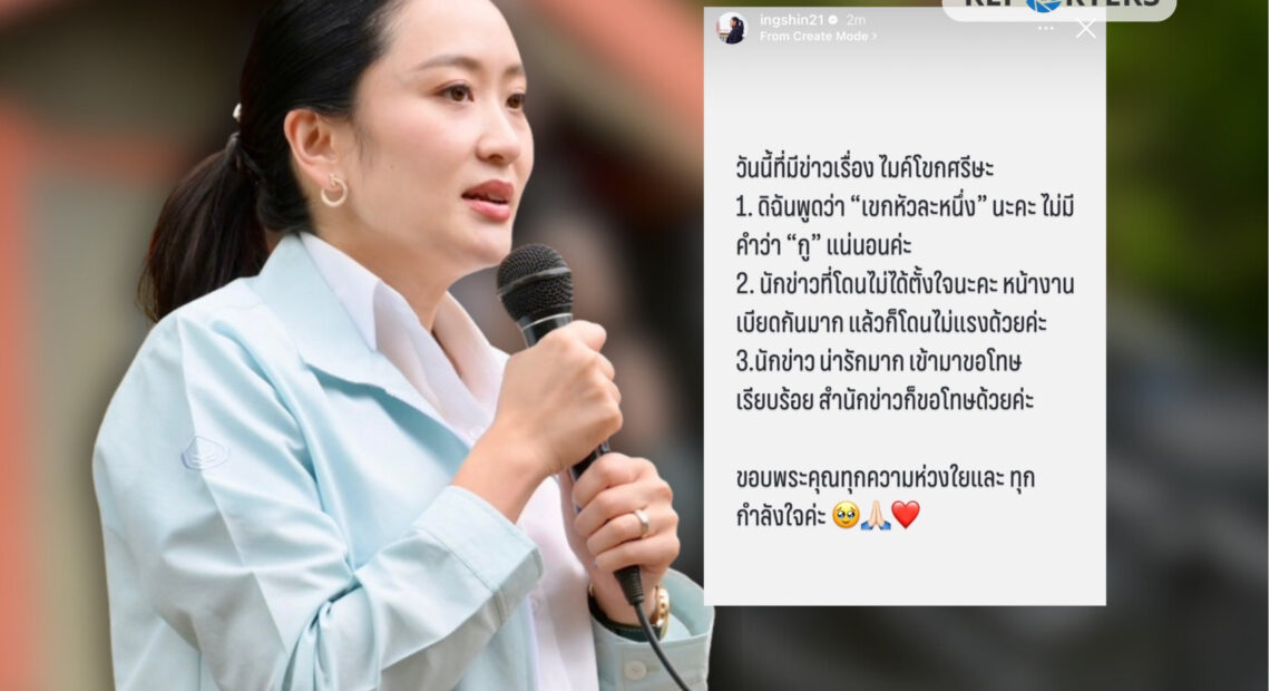 วันนี้ (20 มิ.ย. 68) นางสาวแพทองธาร ชินวัตร นายกรัฐมนตรี โพสต์ข้อความผ่านสตอรี่อินสตาแกรม ในบัญชีผู้ใช้ @ingshin ถึงกรณีที่ถูกไมโครโฟนโดนศีรษะระหว่างการลงพื้นที่ โดยระบุข้อความว่า