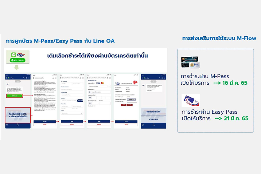 สำหรับการพัฒนาระบบ M-Flow ของการทางพิเศษแห่งประเทศไทย บนทางพิเศษฉลองรัช จำนวน 3 ด่าน (จตุโชติ, สุขาภิบาล 5-1 และสุขาภิบาล 5-2) ปัจจุบันมีความคืบหน้าร้อยละ 90 โดยได้ดำเนินการติดตั้งโครงสร้างคร่อมช่องจราจร (Overhead Gantry) งานติดตั้งอุปกรณ์โครงสร้างคอมพิวเตอร์และเครือข่าย และดำเนินงานทดสอบการทำงานต่อเนื่องของอุปกรณ์ (Burn-In Test) เรียบร้อยแล้ว ขณะนี้อยู่ระหว่างดำเนินการเตรียมงานจัดจ้างพัฒนาระบบ ซึ่งจะติดตั้งและทดสอบระบบ (Soft Opening) ได้ในเดือน มิถุนายน 2565 โดย กทพ. ได้จัดทำแผนการประชาสัมพันธ์ผ่านสื่อโทรทัศน์ วิทยุ Infographic Social Media รวมทั้งมีแผนจะจัด Promotion ส่งเสริมการสมัครและใช้งานระบบ M-Flow ช่วงระหว่างเดือน พฤษภาคม – มิถุนายน 2565 โดยผู้ใช้บริการที่จะ Update Easy Pass เพื่อสมัครระบบ M-Flow จะได้รับเงินเติมลงในบัตร Easy Pass จำนวน 50 บาท (เฉพาะ 10,000 บัตรแรก)