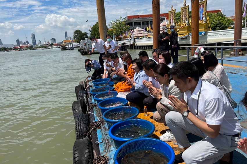 จากนั้น คณะฯ ได้ร่วมกันปล่อยปลาดุก ปลาช่อน และปลาไหลไข่ อย่างละ 99 ตัว ก่อนที่จะร่วมกันห่มผ้าพระปรางค์วัดอรุณฯ