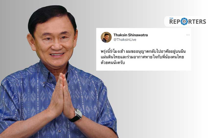 POLITICS ‘ทักษิณ’ ยืนยัน กลับไทยแน่ 22 ส.ค. ขออนุญาตกลับไปอาศัยบนผืนแผ่นดินไทย วันที่ 21 ส.ค.66 เวลา 16.40 น.นายทักษิณ ชินวัตร ทวิตยืนยันว่า “พรุ่งนี้9โมงเช้า ผมขออนุญาตกลับไปอาศัยอยู่บนผืนแผ่นดินไทยและร่วมอากาศหายใจกับพี่น้องคนไทยด้วยคนน้ะครับ” ถือเป็นการยืนยันการเดินทางกลับประเทศไทย ของนายทักษิณ ชินวัตร ในรอบ 17 ปี Tags: กลับไทย ทักษิณ ชินวัตร แนะแนวเรื่อง Previous Previous post: ‘เศรษฐา’ เปิดใจ จำเป็นเดินหน้ารัฐบาลเพื่อไทย แก้ไขวิกฤตประเทศNext Next post: ‘เพื่อไทย’ แจ้ง สส.ยืนยันเสนอชื่อ ‘เศรษฐา’ เป็นนายกฯ Related Posts ‘ธรรมนัส‘ มอง ศึกซักฟอกไม่เข้มข้นเท่ายุคก่อน ฟาด ฝ่ายค้าน ใช้ข้อมูลซ้ำซาก นายกฯ พร้อมสั่งการช่วยเหลือน้ำท่วมเชียงรายทันที หลังแถลงนโยบายต่อรัฐสภา ครม.เห็นชอบตั้งเขตเศรษฐกิจพิเศษเพิ่ม 6 แห่ง ในพื้นที่ EEC