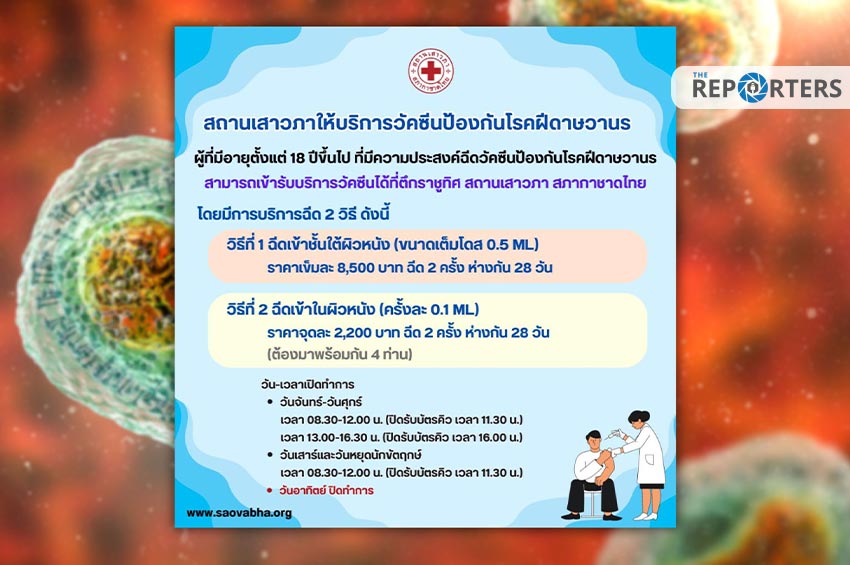 สถานเสาวภาให้บริการวัคซีนป้องกันโรคฝีดาษวานร เข็มละ 8,500 บาท หรือ เข็มละ 2,200 บาท ฉีด 2 ครั้ง