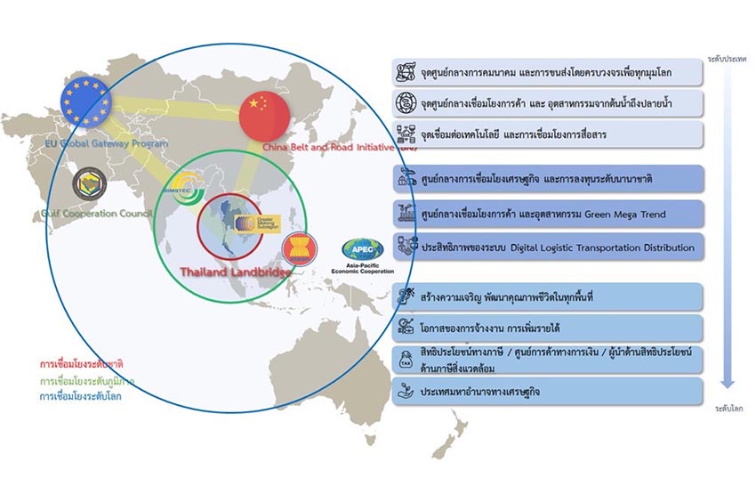 สำหรับกรณีโครงการที่มีเจ้าของโครงการหลายหน่วยงาน เป็นต้น และได้เร่งรัดให้ สนข. จัดเตรียมข้อมูลรายละเอียด เพื่อนำเสนอ Thai Landbridge Model ในเวทีการประชุมคณะทำงานด้านการขนส่งของเอเปค ครั้งที่ 52 (APEC Transportation Working Group : TPTWG 52) พร้อมเตรียม Road Show ทั้งในและต่างประเทศ เพื่อดึงดูดความสนใจของนักลงทุนทั่วโลก รวมถึงการประชาสัมพันธ์เชิงรุกทั้งในระดับพื้นที่โครงการ และการประชาสัมพันธ์ไปสู่นักลงทุนต่างประเทศในช่องทางต่าง ๆ
