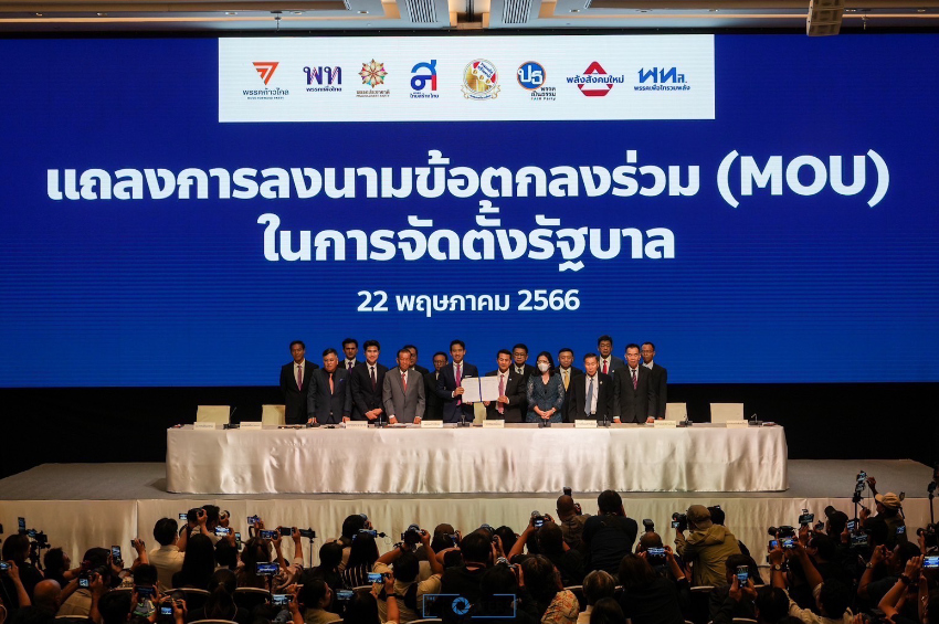 วันนี้ (22 พ.ค.66) เวลาประมาณ 16.50 น. ที่โรงแรมคอนราด กรุงเทพมหานคร นายพิธา ลิ้มเจริญรัตน์ หัวหน้าพรรคก้าวไกล นพ.ชลน่าน ศรีแก้ว หัวหน้าพรรคเพื่อไทย นายวันมูหะมัดนอร์ มะทา หัวหน้าพรรคประชาชาติ คุณหญิงสุดารัตน์ เกยุราพันธุ์ หัวหน้าพรรคไทยสร้างไทย พล.ต.อ. เสรีพิศุทธ์ เตมียเวส หัวหน้าพรรคเสรีรวมไทย นายวสวรรธน์ พวงพรศรี หัวหน้าพรรคเพื่อไทรวมพลัง นายปิติพงศ์ เต็มเจริญ หัวหน้าพรรคเป็นธรรม และนายเชาวฤทธิ์ ขจรพงศกีรติ หัวหน้าพรรคพลังสังคมใหม่ ในฐานะพรรคร่วมจัดตั้งรัฐบาล จัดแถลงข่าวการลงนามบันทึกความเข้าใจร่วมกันในการตั้งรัฐบาล (MOU)