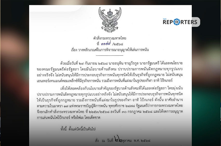 วันนี้ (22 ต.ค. 68) นายอนุทิน ชาญวีรกูล นายกรัฐมนตรี และรัฐมนตรีว่าการกระทรวงมหาดไทยกระทรวงมหาดไทย ลงนามในคำสั่งกระทรวงมหาดไทย ที่ 3179/2568 เรื่อง วางหลักเกณฑ์ในการพิจารณาอนุญาตให้เล่นการพนัน เนื้อหาระบุว่า ด้วยเมื่อวันที่ 29 กันยายน 2568 นายอนุทิน ชาญวีรกูล นายกรัฐมนตรี ได้แถลงนโยบายของคณะรัฐมนตรีต่อรัฐสภา โดยมีนโยบายด้านสังคม ปราบปรามการพนันผิดกฎหมายทุกรูปแบบอย่างจริงจัง ไม่สนับสนุนให้มีการประกอบธุรกิจการพนันทุกชนิดให้เป็นธุรกิจที่ถูกกฎหมาย ไม่สนับสนุนเอนเทอร์เทนเมนต์คอมเพล็กซ์ที่มีธุรกิจการพนัน รวมถึงการพนันที่แฝงมาในรูปของกีฬา อาทิ โป๊กเกอร์