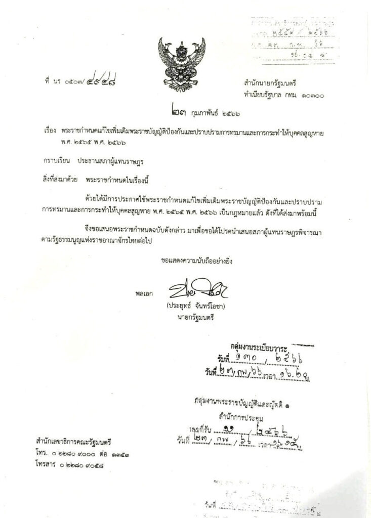 “ด้วยได้มีการประกาศใช้ พ.ร.ก. แก้ไขเพิ่มเติม พ.ร.บ. ป้องกันและปราบปรามการทรมานและการกระทำให้บุคคลสูญหาย พ.ศ. 2565 พ.ศ. 2566 เป็นกฎหมายแล้ว ดังที่ได้ส่งมาพร้อมนี้