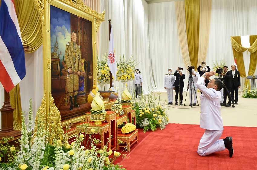 จากนั้น นายเศรษฐา ทวีสิน เปิดกรวยดอกไม้ และถวายบังคม ต่อหน้าพระบรมสาทิสลักษณ์ พระบาทสมเด็จพระเจ้าอยู่หัว เป็นจำนวน 3 ครั้ง