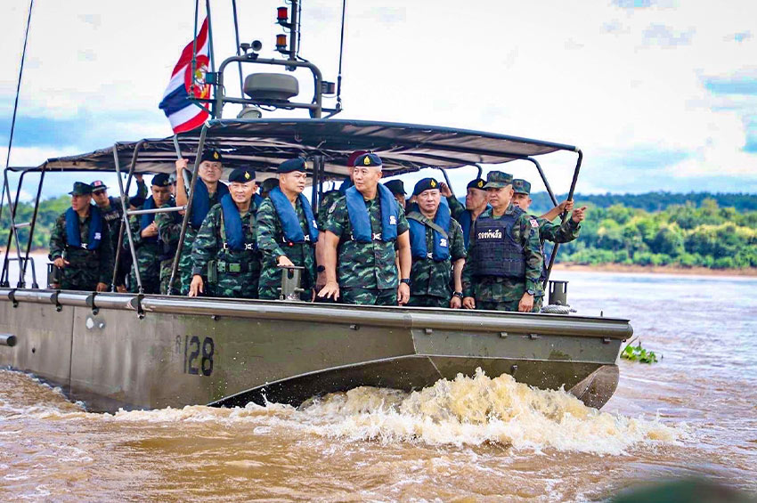 จากนั้นผู้บัญชาการทหารบกและคณะได้เดินทางไปยังสถานีเรือโขงเจียม จ.อุบลราชธานี เพื่อตรวจเยี่ยมการปฏิบัติงานของหน่วยเรือรักษาความสงบเรียบร้อยตามลำแม่น้ำโขง (นรข.) ของกองทัพเรือที่ปฏิบัติภารกิจเสริมความมั่นคงตามแนวชายแดนไทย-สปป.ลาว ร่วมกับกองกำลังสุรนารีมาอย่างต่อเนื่อง โดยได้พบปะพูดคุยกำลังพล ขอบคุณและให้กำลังใจเจ้าหน้าที่ที่ปฏิบัติงานในพื้นที่ชายแดนด้วยความทุ่มเทและเสียสละ ก่อนร่วมลาดตระเวนตรวจภูมิประเทศทางน้ำ เพื่อติดตามสถานการณ์ตามแนวชายแดนตลอดลำน้ำโขงอย่างใกล้ชิด