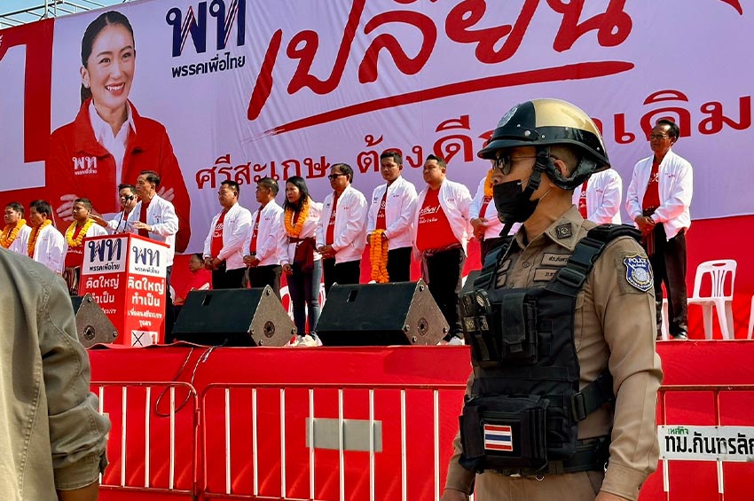 ‘ทักษิณ’ ปราศรัยช่วยผู้สมัครนายก อบจ.ศรีษะเกษ ตร. คุมเข้มทั้งใน และนอกเครื่องแบบ