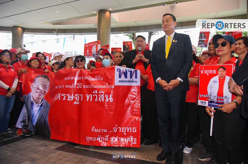 วันนี้ (24 ส.ค. 66) บรรยากาศบริเวณหน้าที่ทำการพรรคเพื่อไทย มีกลุ่มคนเสื้อแดงปทุมธานี นำโดย นายยุทธศักดิ์ ชูประเสริฐ อดีตผู้สมัคร สส.ปทุมธานี เขต 3 พรรคเพื่อไทย มายื่นหนังสือ และมอบดอกไม้ให้กำลังใจ นายเศรษฐา ทวีสิน นายกรัฐมนตรี ซึ่งมีนายวิสุทธิ์ ไชยณรุณ ลงมารับ