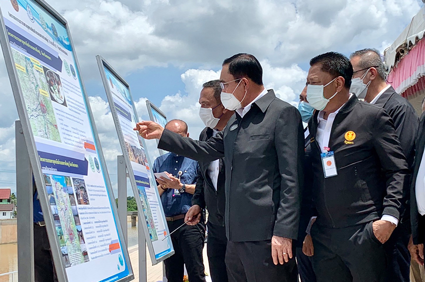 โดยเมื่อนายกรัฐมนตรีมาถึง ได้กล่าวทักทายกับคณะผู้บริหารท้องถิ่นที่มารอต้อนรับ ก่อนรับฟังรายงานสถานการณ์และการแก้ไขปัญหาน้ำในพื้นที่ ซึ่งนายกรัฐมนตรีได้สอบถามถึงอุปสรรคและปัญหา ซึ่งเป็นการแก้ไขมาจากฐานข้อมูลเดิม ว่ามีปัญหามาตั้งแต่เมื่อใด ซึ่งนโยบายของรัฐบาลคือจะลดความเสียหายให้มากที่สุดหรือไม่เสียหายเลย เพราะต้องใช้งบประมาณลงไปชดเชยเยียวยาเยอะแยะไปหมด ซึ่งก็คาดการณ์ว่าจะสามารถแก้ไขปัญหาให้ได้ นอกเสียจากปัญหาสภาวะอากาศเปลี่ยนแปลง แต่ต้องให้ประชาชนเข้าใจว่าโลกมีการเปลี่ยนแปลง