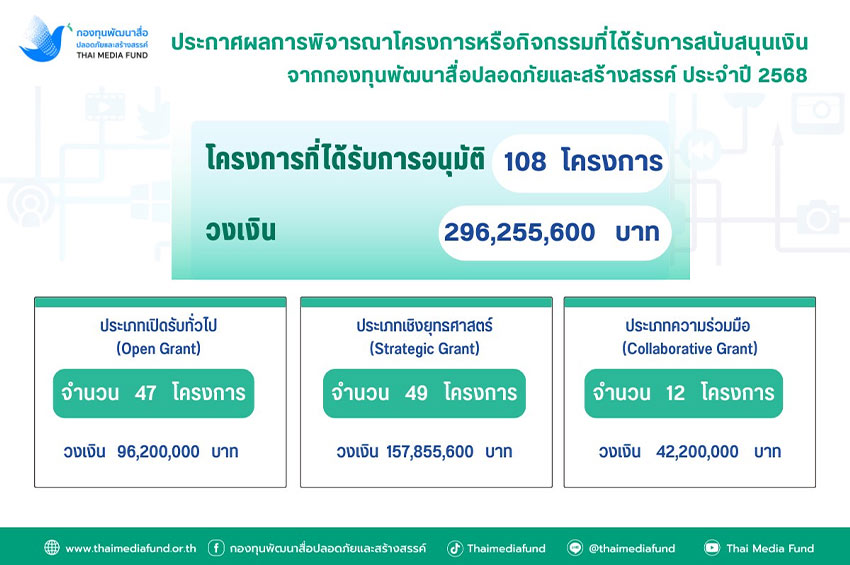 เมื่อวันที่ 24 ก.ย. 68 คณะกรรมการกองทุนพัฒนาสื่อปลอดภัยและสร้างสรรค์ ประกาศผลการพิจารณาอนุมัติทุนประจำปี 2568 จำนวน 108 โครงการ รวมวงเงิน 296,255,600 บาท จากผู้ยื่นข้อเสนอทั้งสิ้น 1,173 โครงการ โดยการประกาศผลครั้งนี้ล่าช้ากว่ากำหนดการเดิมประมาณ 4 เดือน