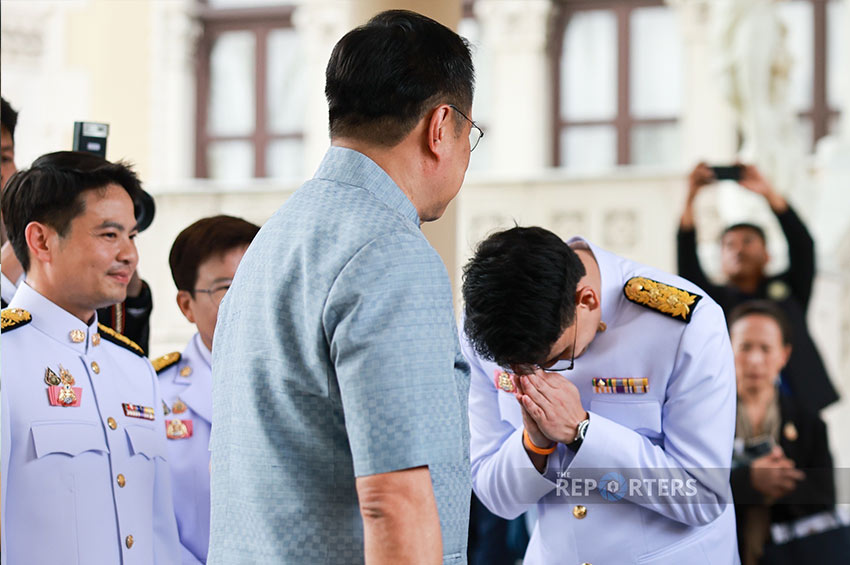 ทันทีที่นายกรัฐมนตรีเดินทางมาถึง มีรัฐมนตรีของพรรคภูมิใจไทย มารอต้อนรับ อาทิ นายไชยชนก ชิดชอบ รัฐมนตรีว่าการกระทรวงดิจิทัล เพื่อเศรษฐกิจและสังคม (ดีอี) น.ส.มัลลิกา จิระพันธุ์วาณิช รัฐมนตรีช่วยว่าการกระทรวงคมนาคม นายภราดร ปริศนานันทกุล รัฐมนตรีประจำสำนักนายกรัฐมนตรี โดยมีจังหวะที่นายกรัฐมนตรี เดินเข้ามาเพื่อทักทายรัฐมนตรีทั้ง 3 คน นายกรัฐมนตรีได้ตรวจดูความเรียบร้อยชุดปกติขาว ของทั้ง 3 รัฐมนตรี ก่อนที่จะได้ติดขอที่ปกเสื้อให้กับนายไชยชนก