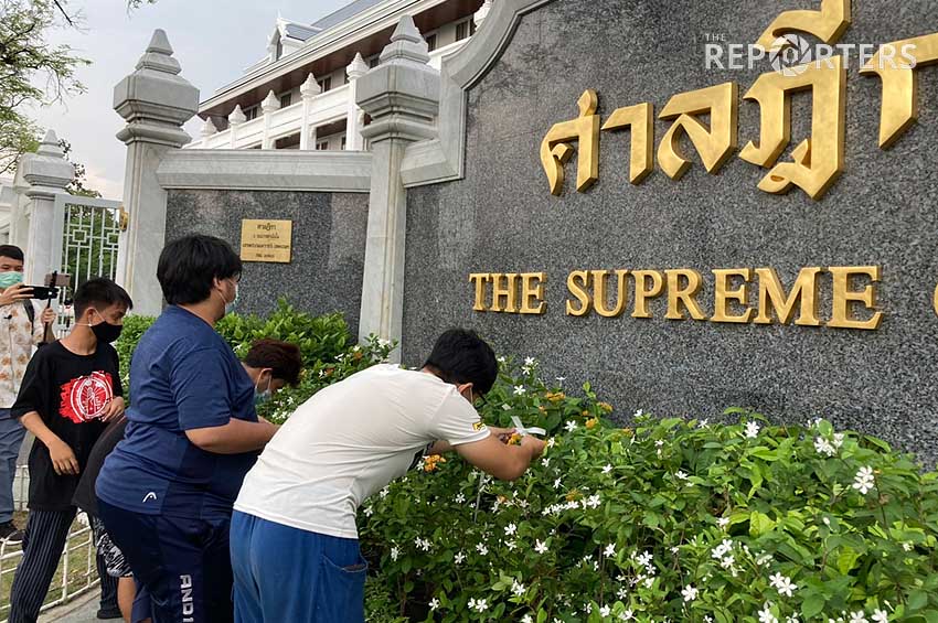 วันนี้ (26 เม.ย. 64) บริเวณหน้าศาลฎีกา จากกรณีที่กลุ่มแนวร่วมธรรมศาสตร์และการชุมนุม จัดกิจกรรม ‘อยู่หยุดขัง’ ปักหลักค้างคืนหน้าศาลฎีกา เพื่อเรียกร้องให้ปล่อยตัวแกนนำราษฎร โดยเริ่มต้นปักหลักตั้งแต่เมื่อวานนี้ (25 เม.ย.) โดยเวลา 16.00 น. ทางกลุ่มได้จัดกิจกรรมผูกริบบิ้นสีขาวเพื่อเป็นการแสดงออกเชิงสัญลักษณ์สะท้อนให้เห็นกระบวนการยุติธรรมที่เกิดขึ้นในสังคมไทย