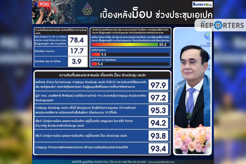 ส่วนความคิดเห็นของประชาชนต่อเบื้องหลัง ม็อบ ช่วงประชุมเอเปค 2022 พบว่า ส่วนใหญ่หรือร้อยละ 97.9 พอใจการทำงานของตำรวจ ในการควบคุมการชุมนุมช่วงการประชุมเอเปค โดยระบุว่า ทำดีกว่าหลายประเทศที่พัฒนาแล้ว เช่น สหรัฐอเมริกา และชาติยุโรปตะวันตก ที่มีการยิงผู้ชุมนุมจนมีผู้เสียชีวิตและบาดเจ็บสาหัสหลายราย นอกจากนี้ ยังพบว่าส่วนใหญ่หรือร้อยละ 97.2 มองว่า นายชัชชาติ สิทธิพันธุ์ ผู้ว่าฯ กทม. ควรได้รับการตำหนิ ที่ละเลยหน้าที่ในการควบคุมห้ามปรามม็อบ