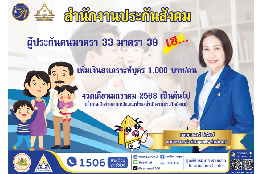 ข่าวดี! ผู้ประกันตนรับเงินสงเคราะห์บุตรเพิ่มเป็นพันบาทต่อบุตรหนึ่งคน เริ่ม ม.ค. 68