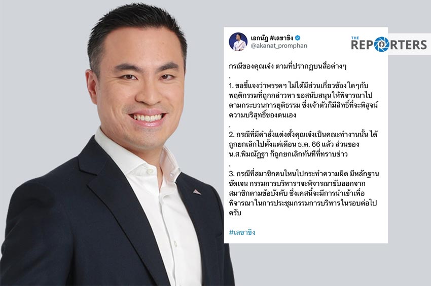 2.กรณีที่มีคำแต่งตั้ง คุณเจ๋ง เป็นคณะทำงานนั้น ได้ถูกยกเลิกไปตั้งแต่เดือนธ.ค.66 แล้ว ส่วนของ น.ส.พิมณัฏฐา ก็ถูกยกเลิกทันทีที่ทราบข่าว