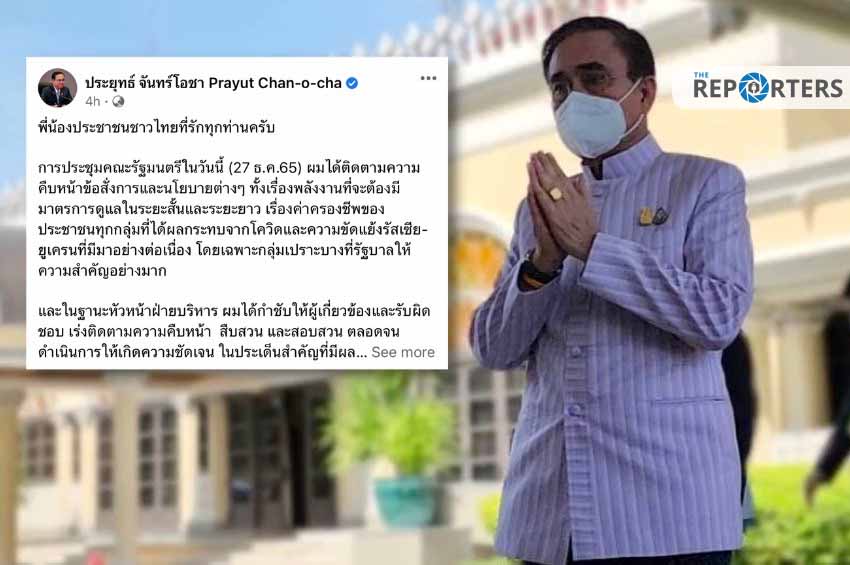 พล.อ.ประยุทธ์ จันทร์โอชา นายกรัฐมนตรีและรมว.กลาโหม โพสต์ข้อความบนเฟซบุ๊ก ระบุว่า การประชุมคณะรัฐมนตรีในวันนี้ (27 ธ.ค. 65) ตนได้กำชับให้ผู้เกี่ยวข้องและรับผิดชอบ เร่งติดตามความคืบหน้า สืบสวน และสอบสวน ตลอดจนดำเนินการให้เกิดความชัดเจน ในประเด็นสำคัญที่มีผลต่อความรู้สึกของประชาชน โดยให้รายงานผลความคืบหน้าหรืออุปสรรคให้นายกรัฐมนตรีทราบ ทุก 15 วัน ประกอบด้วย
