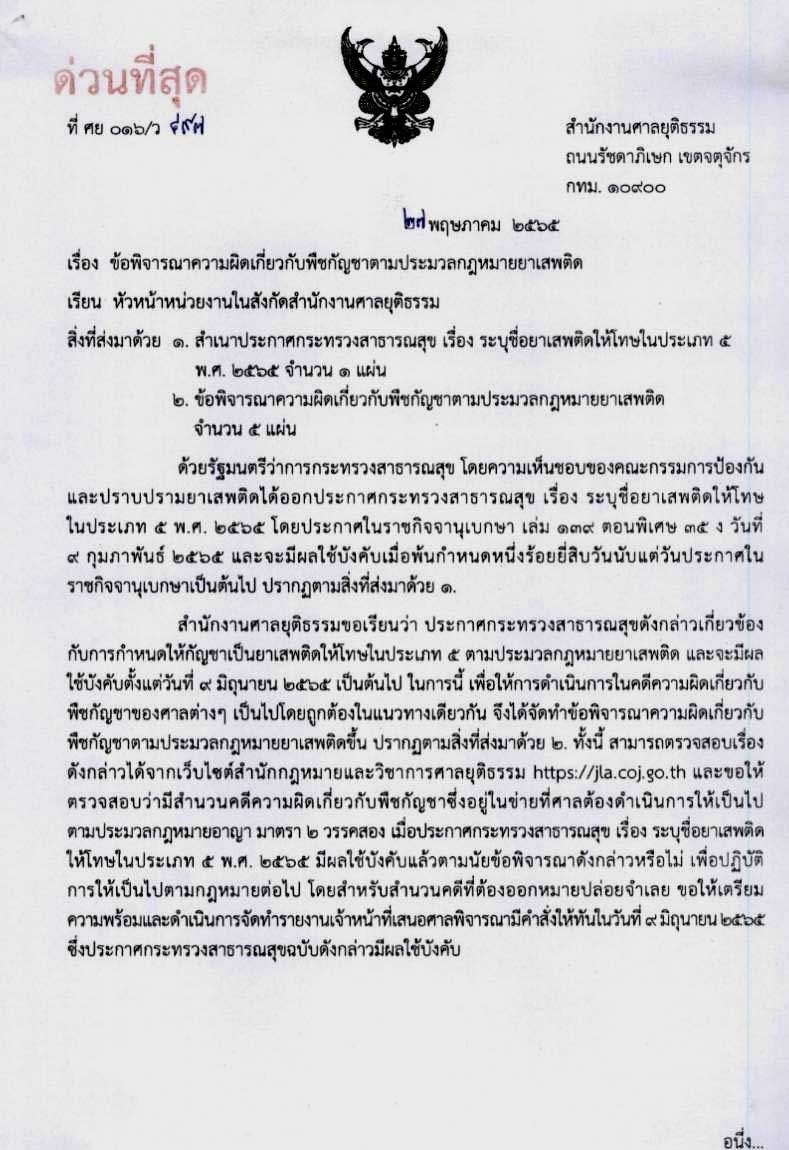 ทั้งนี้ สามารถตรวจสอบเรื่อง ดังกล่าวได้จากเว็บไซต์สํานักกฎหมายและวิชาการศาลยุติธรรม https://jta.coj.go.th และขอให้ตรวจสอบว่ามีสํานวนคดีความผิดเกี่ยวกับพืชกัญชาซึ่งอยู่ในข่ายที่ศาลต้องดําเนินการให้เป็นไป ตามประมวลกฎหมายอาญา มาตรา 2 วรรคสอง เมื่อประกาศกระทรวงสาธารณสุข เรื่อง ระบุชื่อยาเสพติด ให้โทษในประเภท 5 พ.ศ. 2565 มีผลใช้บังคับแล้วตามนัยข้อพิจารณาดังกล่าวหรือไม่ เพื่อปฏิบัติการให้เป็นไปตามกฎหมายต่อไป โดยสําหรับสํานวนคดีที่ต้องออกหมายปล่อยจําเลย ขอให้เตรียม ความพร้อมและดําเนินการจัดทํารายงานเจ้าหน้าที่เสนอศาลพิจารณามีคําสั่งให้ทันในวันที่ 9 มิถุนายน 2565 ซึ่งประกาศกระทรวงสาธารณสุขฉบับดังกล่าวมีผลใช้บังคับ
