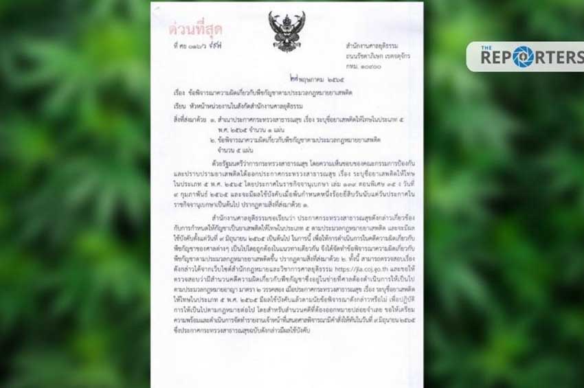สำนักงานศาลยุติธรรม ออกจดหมายเวียน รับมือ ปลดล็อกกัญชา กัญชง ให้ทัน 9 มิ.ย.