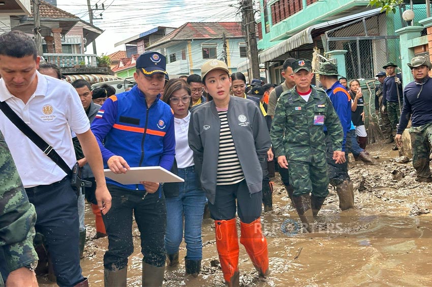 จากนั้น ในเวลา 09:55 น. นายกรัฐมนตรี และคณะรัฐมนตรี เดินทางมาถึงที่บ้านเกาะทราย อ.แม่สาย จ.เชียงราย ได้เดินลุยโคลน และรับฟังสรุปแผนการดำเนินงาน พร้อมตรวจเยี่ยมให้กำลังใจผู้ประสบภัย และเจ้าหน้าที่ผู้ปฏิบัติงาน และได้เข้าไปตรวจเยี่ยมตามบ้านเรือนของประชาชน เพื่อรับฟังปัญหาปรับทุกข์ของผู้คนในชุมชน ซึ่งมีผู้คนในชุมชนต่างบอกเล่าถึงปัญหาให้กับนายกฯ รวมถึงมีผู้สูงอายุเข้ามาพูดคุยกับนายกฯ อีกด้วย โดย น.ส.แพทองธาร ระบุว่า เป็นกำลังกำลังใจให้ทุกคนขอให้สู้ ๆ ซึ่งขณะนี้กองทัพ และอุปกรณ์เครื่องไม้ เครื่องมือ เครื่องจักรทุกอย่างยังอยู่ในพื้นที่ช่วยเหลือ จนกว่าเข้าสู่ภาวะปกติ ยืนยันว่า ไม่ต้องห่วง