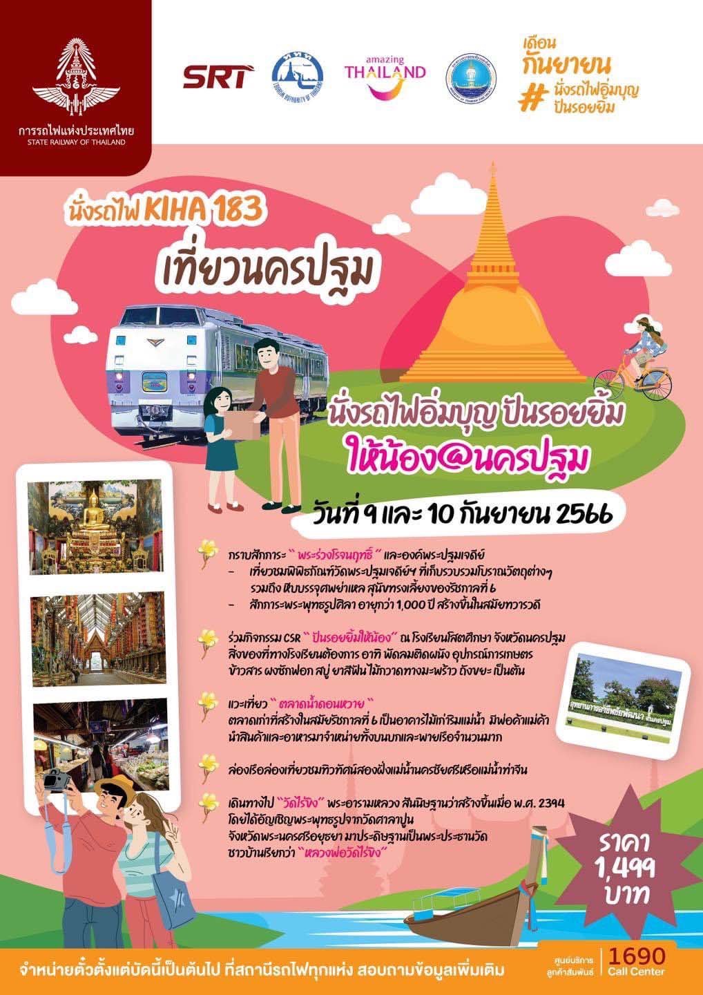 นายเอกรัช ศรีอาระยันพงษ์ หัวหน้าสำนักงานผู้ว่าการ การรถไฟแห่งประเทศไทย จัดโปรแกรมท่องเที่ยวแบบไปเช้าเย็นกลับ ที่ใช้ชื่อว่า “ทริปอิ่มบุญ ปันรอยยิ้มให้น้อง @ นครปฐม” ในวันที่ 9 และ 10 กันยายน 2566 โดยนั่งรถไฟ KIHA 183 ในอัตราท่านละ 1,499 บาท สำหรับโปรแกรมนี้จะพานักท่องเที่ยวชมเมืองส้มโอหวาน แวะนมัสการพระร่วงโรจน์ฤทธิ์ และองค์พระปฐมเจดีย์ สักการะพระพุทธศิลา อายุกว่า 1,000 ปี แวะเที่ยวตลาดน้ำดอนหวายตลาดเก่าแก่ ที่สร้างในสมัยรัชกาลที่ 6
