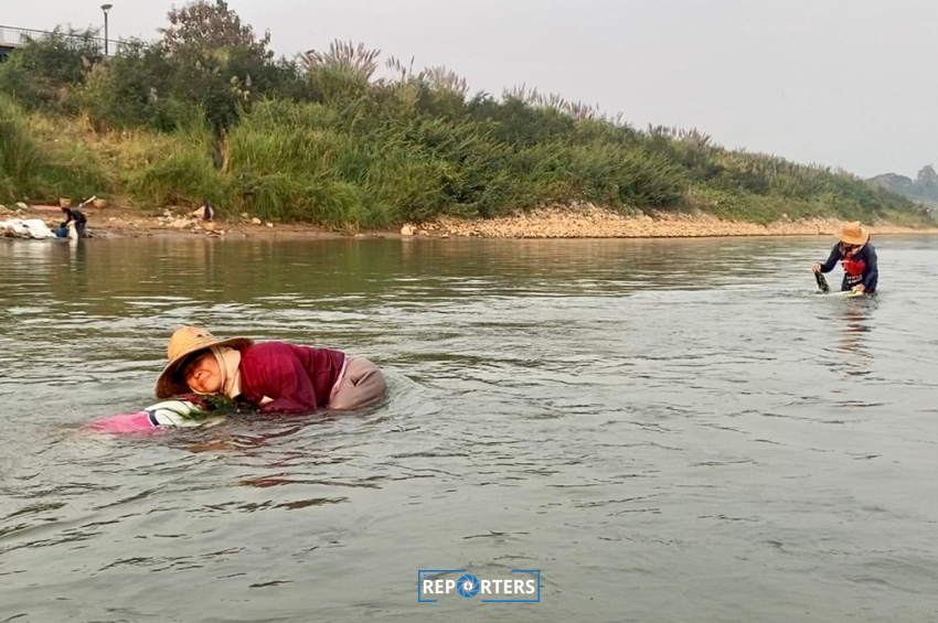 เรือหางยาวเดินออกไปใกล้เคียงแนวร่องน้ำลึก มุ่งหน้าลงใต้ผ่านประติมากรรมปลาบึกพ่นน้ำ พลันเห็นเงาแม่หญิงยืนกระจายตัวบนแม่น้ำโขง ห่างกันราว 2-3 เมตร กำลังง่วนกับบางสิ่งที่ซ่อนอยู่ใต้แม่น้ำโขง