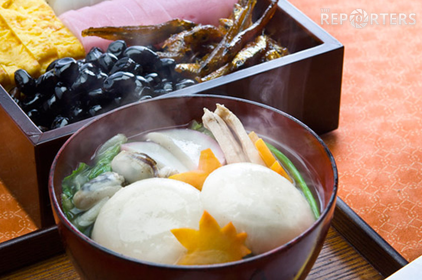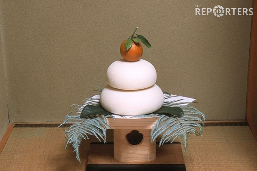 ในช่วงเทศกาลปีใหม่ ชาวญี่ปุ่นมักจะทานโมจิ (mochi) ซึ่งทำจากข้าวเหนียว และนิยมประดับตกแต่งบ้านด้วย คะงะมิโมจิ (Kagamimochi) ซึ่งเป็นโมจิข้าวสองก้อนเรียงซ้อนกันอยู่และวางผลส้มเล็กๆ อยู่บนยอด เพื่อเป็นเครื่องสักการะเทพเจ้าแห่งวันปีใหม่ นอกจากนั้นยังนิยมนำโมจิมาใส่ในน้ำซุป เรียกกันว่าโอะโซนิ (Ozoni) อีกด้วย